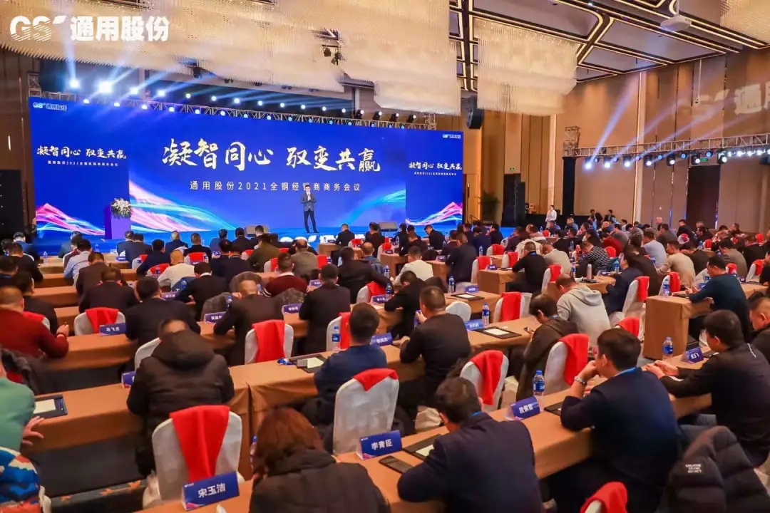 12月24日,正逢圣誕節平安夜,通用股份以凝智同心 馭變共贏為主題召開2021全鋼經銷商商務會議,來自全國各地的近200位經銷商歡聚一