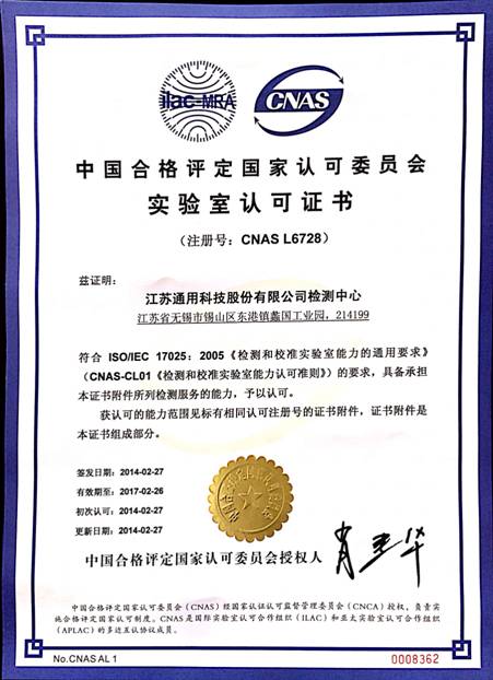 2014年2月27日,中國合格評定國家認可委員會(CNAS)正式授予江蘇通用科技股份有限公司檢測中心國家實驗室認可資質,認可證書編號:L6728。