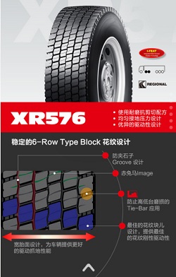 XR576使用耐磨抗剪切配方、均勻接地壓力設(shè)計以及優(yōu)異的驅(qū)動性設(shè)計,寬胎面的設(shè)計為車輛提供更好的驅(qū)動抓地性能。同時采用更加穩(wěn)定的6—Row Type Block花紋設(shè)計,包括防夾石子Groove 設(shè)計;赤兔馬Image;防止高低臺磨損的Tie—Bar應(yīng)用。