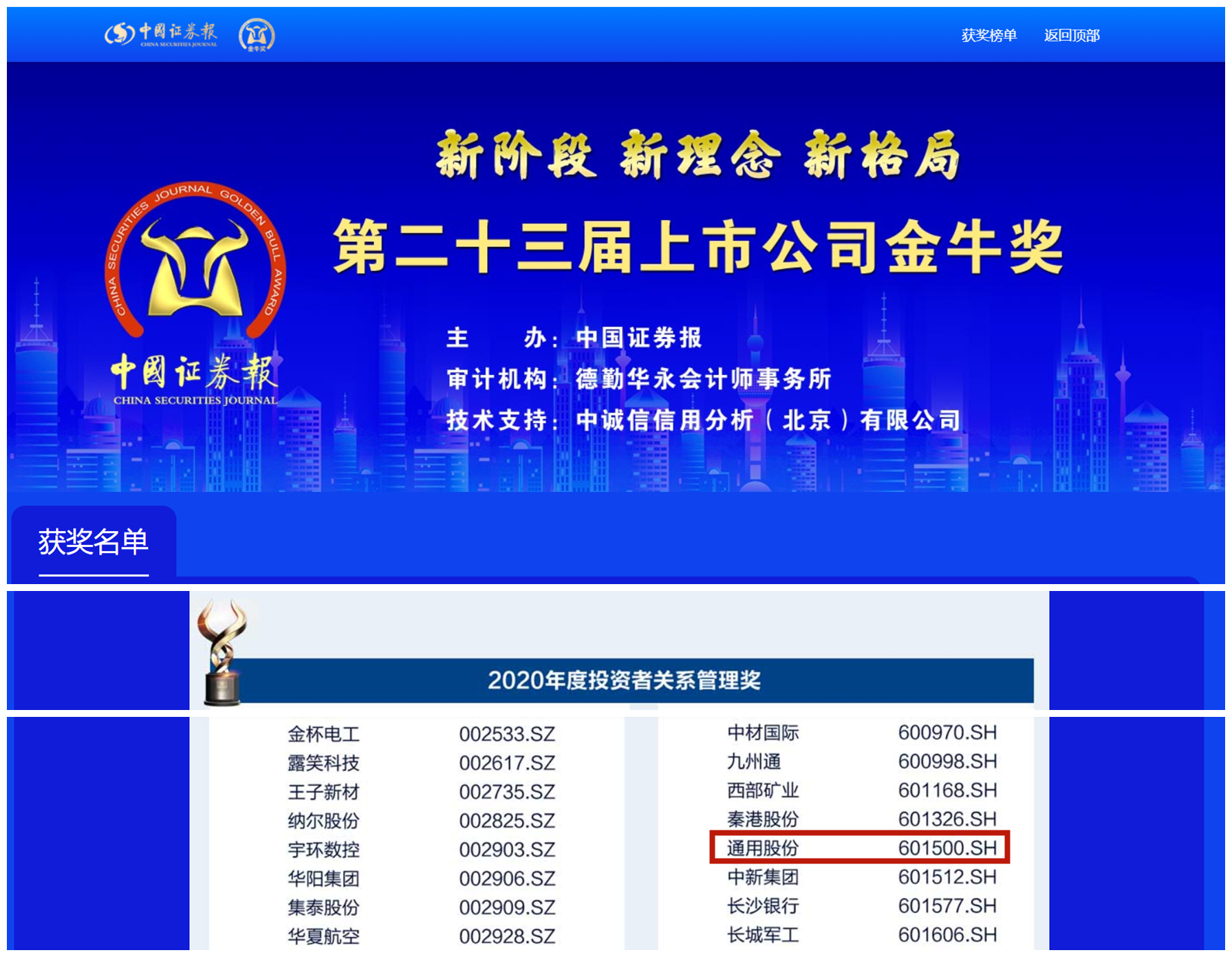 據(jù)了解,金牛獎是中國證券報鼎力打造的金融品牌,旨在公開、公正、公平原則下,表彰上一年度業(yè)績優(yōu)秀、治理卓越、具有崇高使命和社會責(zé)任感的上市公司。自1999年創(chuàng)立以來,金牛獎評選已至第二十三屆,是中國資本市場最具影響力的獎項,在中國資本市場中具有上市公司“奧斯卡”的美譽。