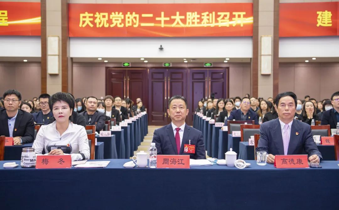 會上,周海江從黨的二十大會議盛況、二十大報告主要內容及深入學習貫徹落實黨的二十大精神等多個方面為波司登全體黨員作了深入的解讀,并列舉剖析了黨的二十大報告中的一系列新專題、新論斷、新提法,同時結合紅豆集團工作實際,分享了民營企業學習貫徹落實黨的二十大精神的特色做法和經驗舉措,給波司登全體黨員作了一個生動、深刻的報告,贏得了全場共鳴。